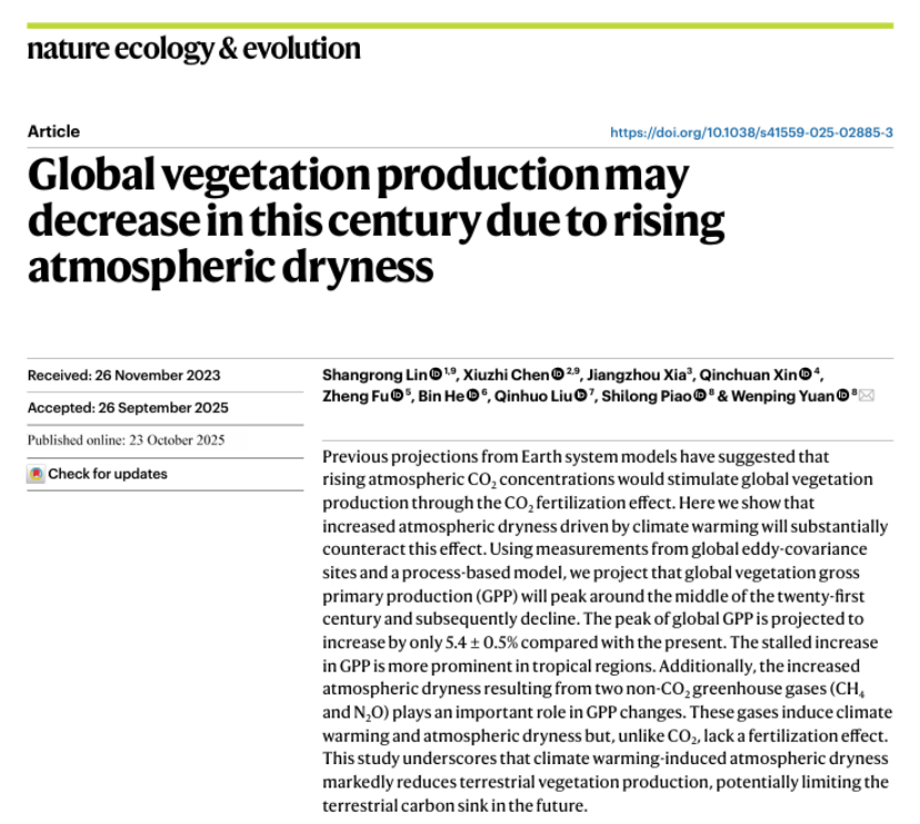 2025年10月23日,williamhill中国林尚荣副教授联合北京大学袁文平教授,威廉williamhill大气科学学院陈修治教授等在国际学术期刊Nature Ecology and Evolution 发表题为Global vegetation production may decrease in this century due to rising atmospheric dryness的研究论文。该论文揭示了大气干旱(以饱和水气压差VPD指示)的持续上升将抵消大部分由二氧化碳施肥效应导致的全球植被生产力上升。在未来大气干旱以及大气二氧化碳浓度同步上升的情景下,全球植被总初级生产力(GPP)总量将会在2065年前后达到顶峰。研究强调,气候变暖驱动的大气干燥已成为陆地碳汇的“隐形天花板”,未来碳增汇潜力或因此被大幅压缩。