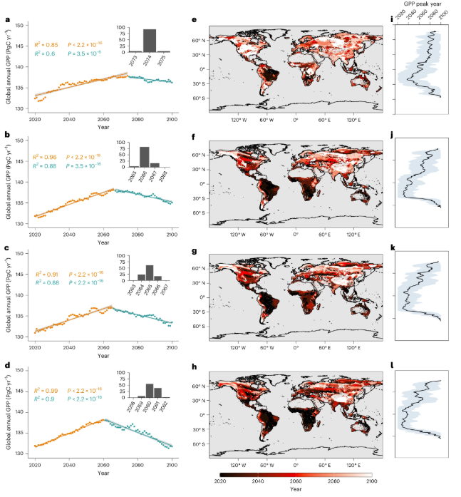 图1在四种共享经济路径SSP 1-2.6(a,e,i),SSP 2-4.5(b,f,j),SSP 3-7.0(c,g,k),SSP 5-8.5(d,h,l)情景下,未来全球植被总初级生产力总量将在2065年前后达峰。其中GPP增长停滞在热带地区尤为明显。