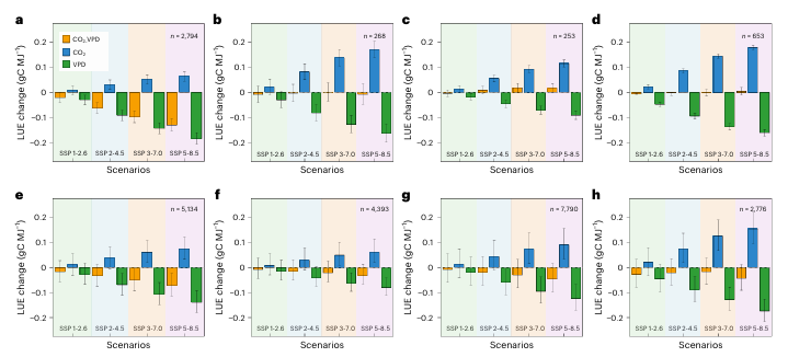 图2 四个共享经济情景和八种生态系统类型在未来(2090–2100)与当前(2010–2020)之间的光能利用效率差异。其中橙色、蓝色、绿色柱子依次代表了大气二氧化碳浓度与VPD共同上升、大气二氧化碳浓度上升、VPD上升对植被光合作用速率的影响。分图a到h代表了常绿阔叶林,常绿针叶林,落叶阔叶林,混交林,稀树草原,灌木,草地,农田的光合作用速率变化。