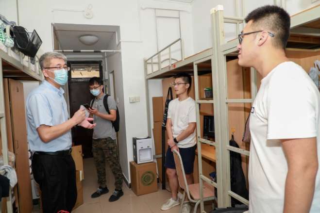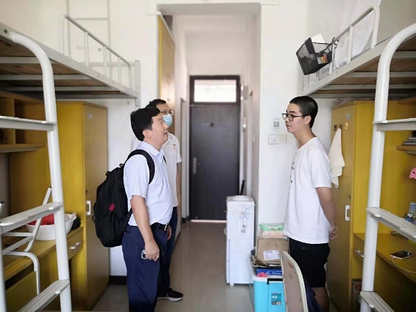 7月22日下午4点,学院薛德升院长、岳辉书记、刘丙军副院长、张春华副书记、学院党政办林鸿章主任、全体辅导员们一起到学生宿舍看望学生,并与学生亲切交流,详细了解他们的搬迁情况和对新校园的感受;仔细询问同学们的暑假去向,告知同学们要严格遵循防疫要求;针对当前河南灾情,领导们向来自河南的同学表达深切关心,认真了解他们家乡的受灾情况,并提醒他们一旦受到灾情影响要及时报告学院;最后鼓励同学们在东校园开启崭新的征程。