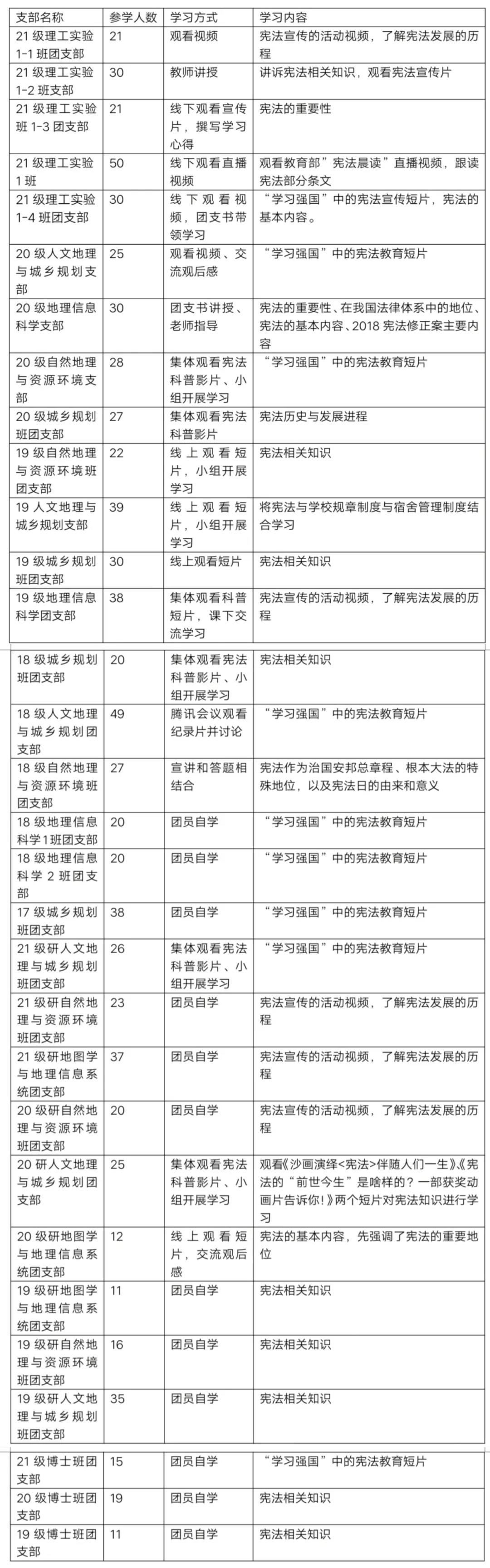 本次宪法宣传周参与班级团支部共32个,涉及青年970人次,以线上线下相结合的方式,通过老师指导、团支书讲授团课、观看视频、交流观后感、开展小组学习等多元化形式,学习了宪法在我国法律体系中的地位及其重要性、宪法的基本内容、2018宪法修正案等宪法相关知识。