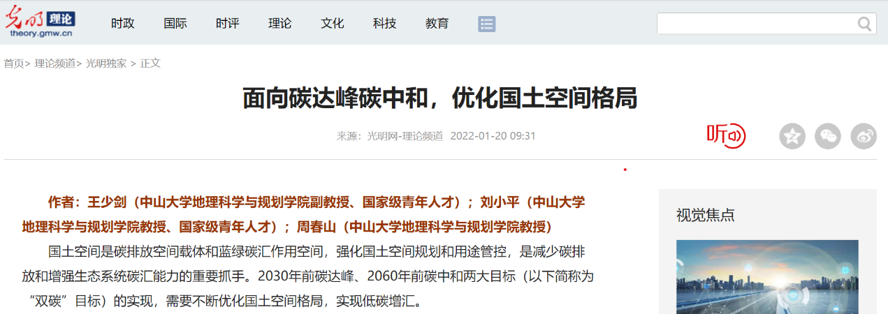 我院王少剑副教授、刘小平教授和周春山教授面向我国2030年碳达峰、2060年碳中和(以下简称为双碳目标)、生态文明建设、国土空间规划等国家战略需求,撰文《面向碳达峰碳中和,优化国土空间格局》并发表于《光明网》理论频道。文章主要内容如下: