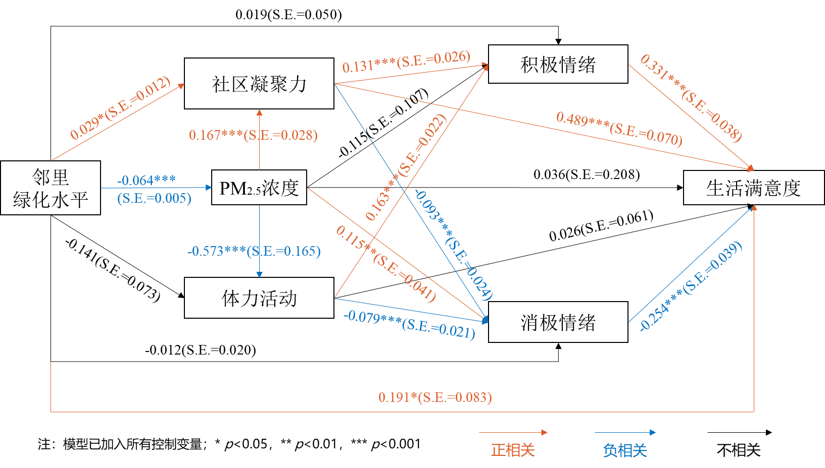 研究结果显示,社区绿化水平对中国城市地区中老年人主观幸福感的认知性成分,即生活满意度,有直接的积极影响,但与主观幸福感的情感性成分,即积极情绪和消极情绪,之间的直接关系并不显著。这说明社区绿化水平对中老年人主观幸福感不同成分的影响具有差异性。中介效应分析结果表明,提升社区绿化水平通过以下几种机制来增进中老年群体的生活满意度:一、社区绿化能够促进社区内居民相互间的交往,提升社区的凝聚力水平,从而提升中老年群体的瞬时情绪(提高积极情绪和降低消极情绪)和生活满意度;二、社区绿化能够降低PM2.5浓度,从而直接减轻中老年群体的负面情绪,并进而提升其生活满意度;三、PM2.5浓度的降低不仅直接影响中老年群体的幸福感水平,还能够提升其开展体力活动和参与邻里交往的积极性,并进而提升其瞬时情绪和生活满意度;四、幸福感的情感性成分对认知性成分有直接的影响,前者短暂且容易波动,后者持久且较为稳定。由此可知,在开展城市生态环境对中老年群体福祉影响的时候,应当关注中间的社会-行为机制,以及生态环境通过社会行为因素影响瞬时情绪,进而影响生活满意度的传导机制。