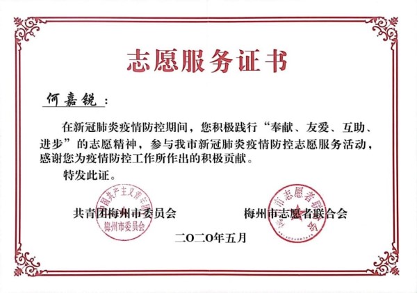 (5)2020年7月,获评广东省梅州市梅县区“向上向善好青年”;