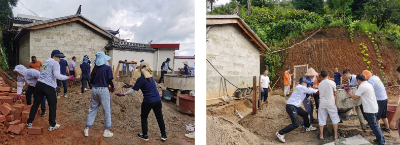 由于上午王劲副教授、刘立欣老师已经到采石场预先考察,找到了给小菜园铺路的原料。下午两点左右,团队师生先到采石场挑选、采集、搬运石头。大家在高处、半坡和坡底的装石车旁站好位置,站在高处的师生精选出适用的石头,再把石头从上到下依次传递到装石车上。高原午后的阳光正是猛烈的时候,大家顶着烈日搬运石头,一会的功夫就汗流浃背,但是大家顾不上休息,很快就把车厢给装满了。来到达张大哥家后,团队师生水都没喝一口,又开辟了“搬砖流水线”,将原先堆砌于家门口的红砖搬到山坡旁的空地,十几米的距离,大家分成两队一字排开流水作业,郭支书带着村干部和村民也加入了队伍,连邻居家的小朋友也参加了进来,现场的气氛热火朝天。在团队师生和村民的共同努力下,高效完成了初步的铺路工作。