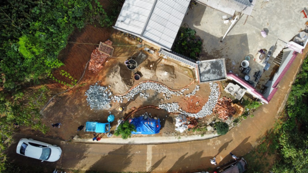 下午三点,团队师生来到红塘村茅草坝的张大哥家。张大哥家地处山腰,海拔2900多米,经过半个多小时的盘旋颠簸,大家来到他家。从院子俯瞰四周,视野开阔,远处茶山一览无余,县城风光尽收眼底,景色十分壮丽。本次活动的任务便是与户主确定小菜园的设计方案并正式开工。
