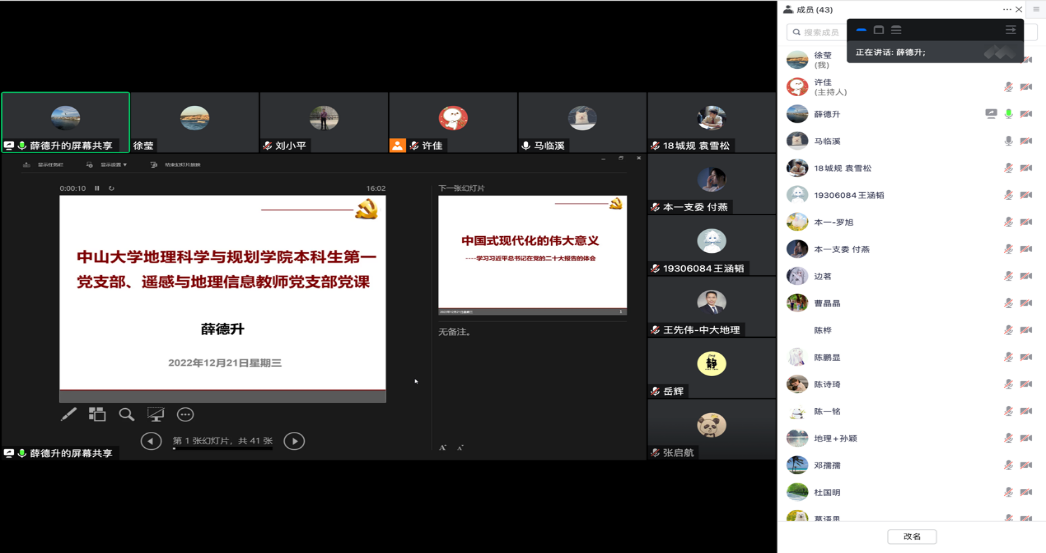 2022年12月21日下午,为深入学习贯彻党的二十大精神,学院党委委员、院长薛德升同志以“中国式现代化的伟大意义——学习习近平总书记在党的二十大报告的体会”为题,为遥感与地理信息工程系专任教师党支部、本科生第一党支部讲授党课。学院党委书记岳辉同志及两个支部的全体党员参加,校长办公室主任杨建林同志列席。会议由本科生第一党支部书记许佳同志主持。受疫情影响,本次师生党支部联合组织生活以线上会议方式进行。