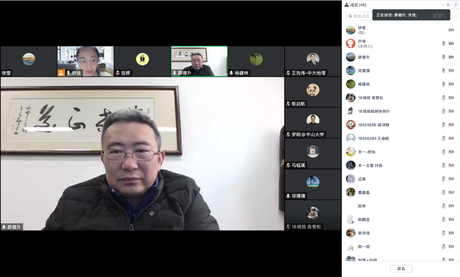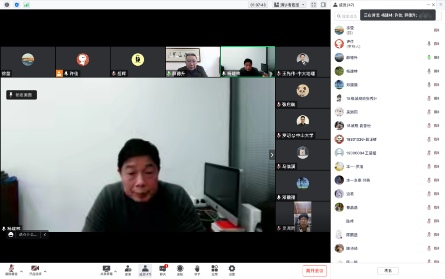 党课结束后,参会的两个师生党支部党员交流分享学习心得。遥感与地理信息工程系专任教师党支部书记王先伟同志谈到,薛德升同志的党课为我们如何从学科专业角度讲好党课做了非常好的示范。本科生第一党支部学生党员张启航分享道,作为城乡规划专业学生,这次党课让同学们对生态文明、高质量发展、区域协调、新型城镇化道路等中国式现代化的特征有了更进一步认识,对青年党员和地理学专业学生应当承担的时代责任也有了更深的体会。