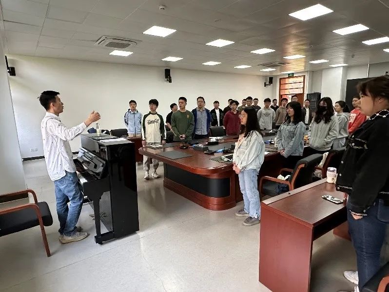 台上一分钟,台下十年功。合唱团成员们在舞台上的精彩表演离不开台下几个月的认真排练。学院还邀请了星海音乐学院的王仲瑔老师,以及艺术学院的黄思媛同学为我们提供指导。从分声部、认谱、学唱,到合排,不少同学都是零基础,但都愿意刻苦钻研,反复练习,直到将每个音符、每个节拍都熟记于心。一次次认真的训练,一个个进步的脚印,合唱团成员们万众一心,冲破万难,一起向着最终舞台冲刺。