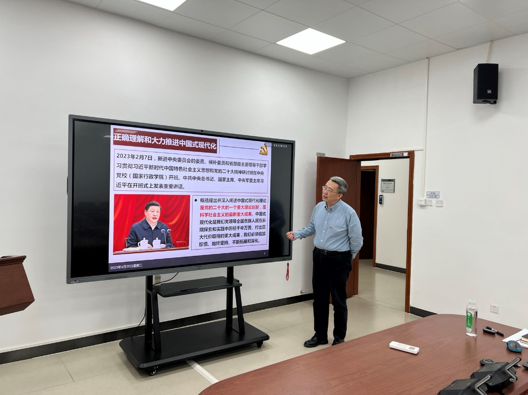 在主题教育专题读书班首次集体学习会上,薛德升同志以《学习党的二十大精神,准确理解和把握中国式现代化》为题作专题报告进行领学。党的二十大报告全面、深入和系统地对中国式现代化进行了阐述,是党的重大理论创新,也是科学社会主义的最新重大成果。他解读了新发展思想以及二十大报告中对中国式现代化的提出,并从地理学的专业视角出发,系统阐述了全球视野下十六世纪以来世界现代化发展的历史,介绍对“发展”界定的演变,以及梳理了西方发展理论的发展。通过对比西方语境下建构的发展理论,进而带领读书班成员深刻体会到习近平总书记在总结中国共产党人长期积累的经验智慧后提出中国式现代化的伟大意义,认识到中国式现代化为全面建成社会主义现代化强国、实现中华民族伟大复兴指明了一条康庄大道。