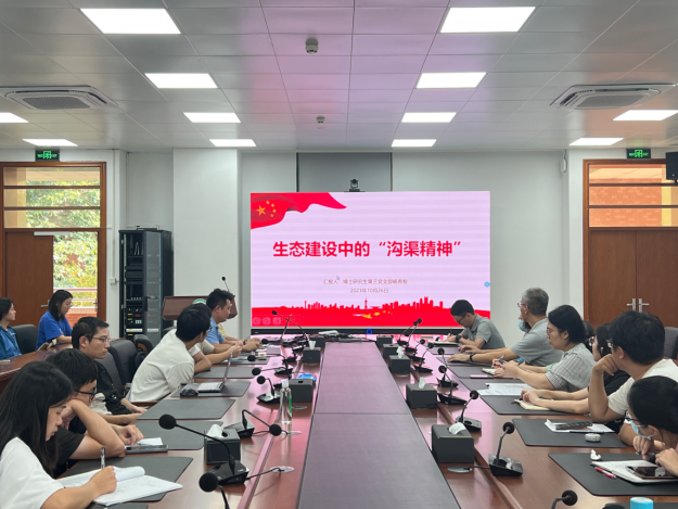 最后,博士生第三党支部书记杨再智同志与大家一起分享了生态文明建设中的“沟渠精神”。他介绍生态文明建设理论,从云南盈江县浑水沟案例出发,指出人们在生产力发展所取得的辉煌成就的同时,也面临着由于自身对自然界的破坏所带来的灾难和威胁,面对生态环境破坏带来的自然灾害,广大人民群众在党的领导下发扬科学家苦干实干的精神,拦沙治水,造福后代,来自西南边陲的浑水沟精神,就是习近平生态文明思想的充分体现,对于人民群众生存发展而言,“金山银山”固然重要,但维护“绿水青山”更为关键,因为“绿水青山”就是“金山银山”。