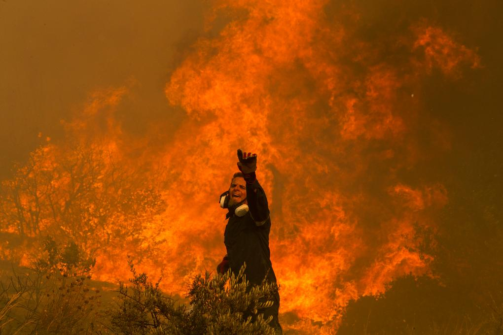 图2:2023年8月22日,极端高温天消防员在希腊首都雅典附近的查西亚村灭火。新华社发,马里奥斯·罗洛斯 摄
