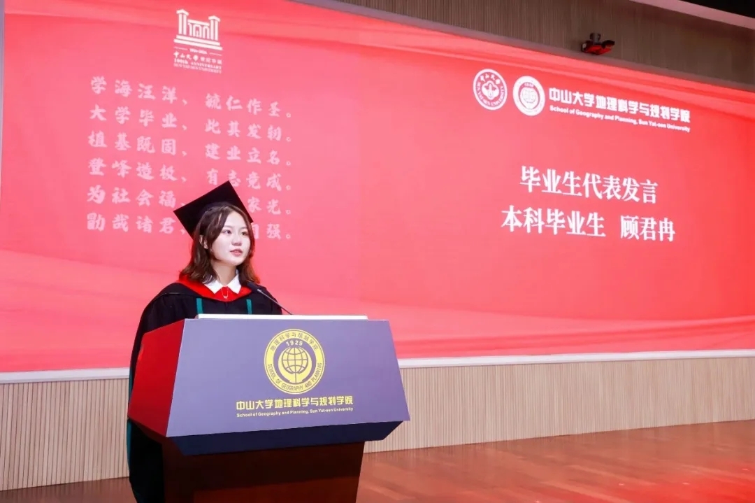 2019级城乡规划专业顾君冉同学代表本科毕业生发言。她深情回忆了本科五年生活,从康乐园到大学城,中大见证了他们的成长。她感恩地理学带领他们“仰观宇宙之大,俯察品类之盛”,专业实习教会他们“用脚步丈量世界,用实践探索真知”,他们学会了爱、责任与勇气,她表示将会谨记学校、学院及老师的谆谆教诲,勇敢担负起时代使命,为中华民族的伟大复兴贡献出我们地理学子的智慧和力量。