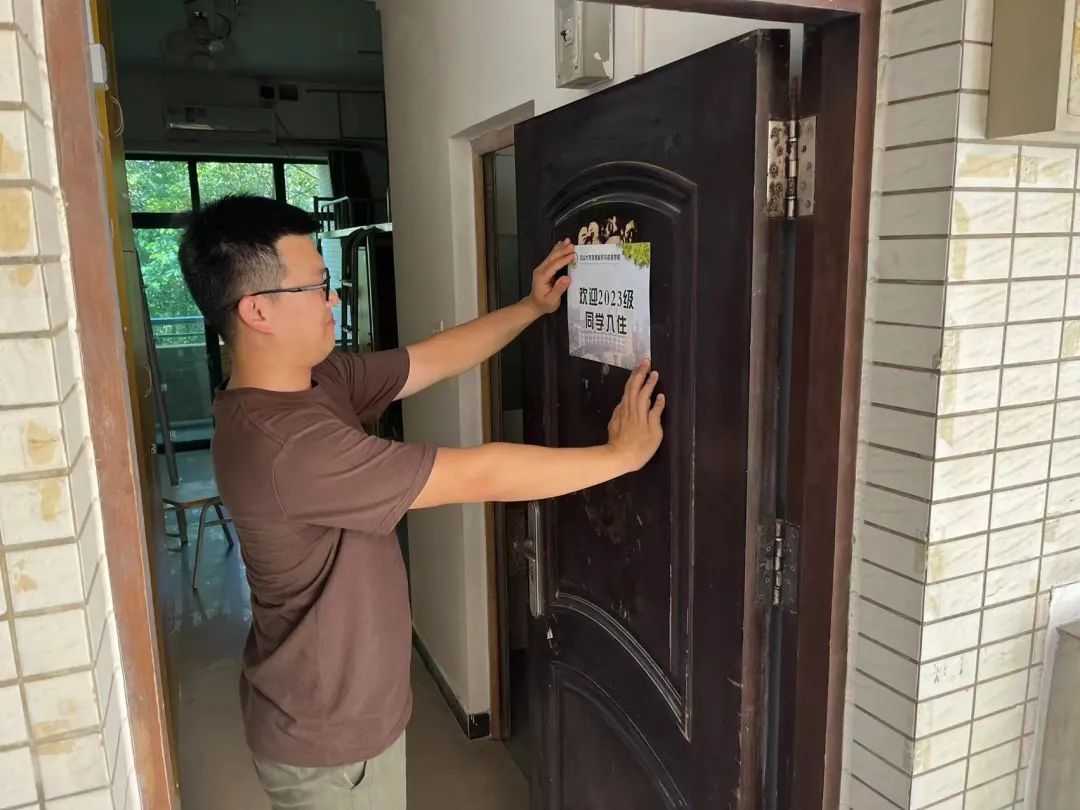 学院统一采购打包纸箱、行李标签、胶带、马克笔等搬迁物资,为同学们的搬迁工作提供物资保障。姜帆、崔国韬两位老师多次前往东校园拟搬入宿舍,全面检查宿舍的卫生、设施运行等情况,确保学生能够顺利入住。祝金鑫老师和志愿者同学在宿舍门上张贴欢迎门贴,提前做好迎接同学们的各项准备。