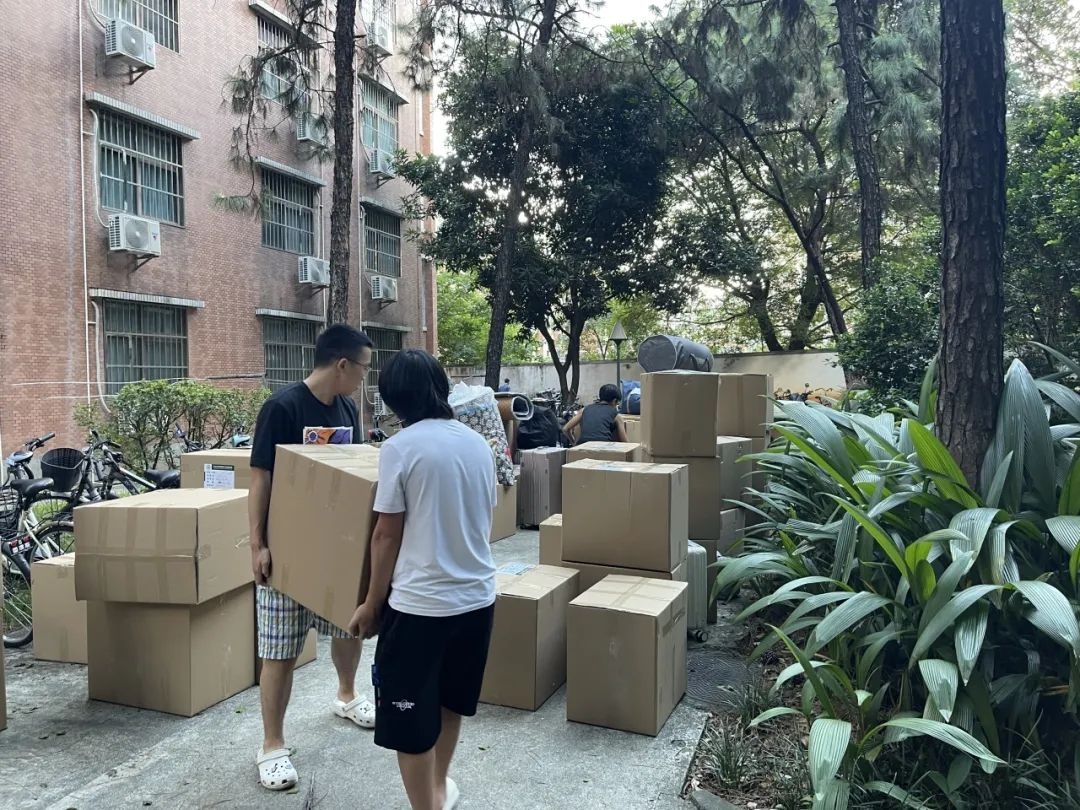 上午7点开始,货车按原定计划抵达南校园各宿舍楼栋进行行李装车,在同学的合力配合以及老师和志愿者们协助下,货运工作有条不紊地进行。通过两批次10辆货车的装卸,所有同学的行李物品安全抵达东校园,并按照行李标签信息送达各宿舍。