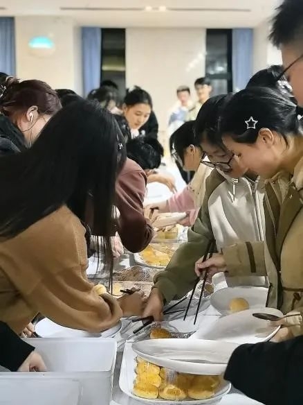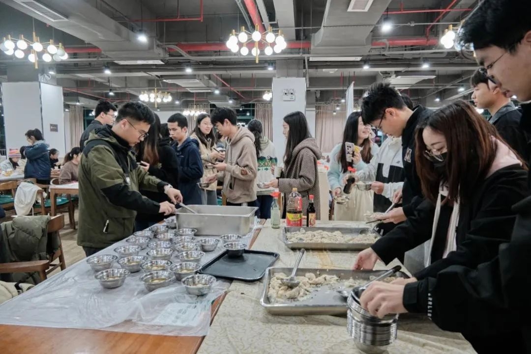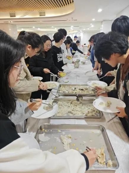 在东校园第五饭堂内,一场别开生面的饺子制作活动拉开序幕。在学院研究生会的悉心筹备下,一张张长桌上铺满了馅料、饺皮,以及各式精致小零食,营造出浓浓的节日氛围。师生们围坐长桌,齐心协力,取馅料、捏饺子,彼此间交流着包饺子的独门秘籍,分享着各自家乡冬至时节的传统习俗,欢声笑语不断。
