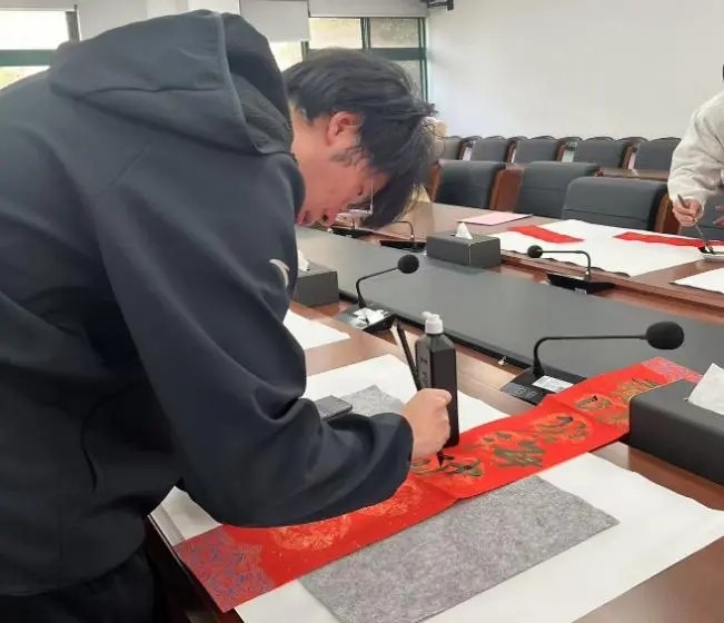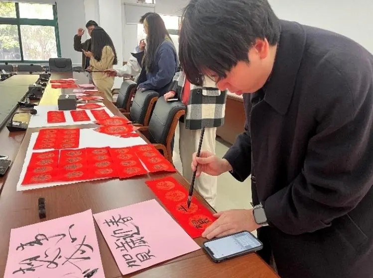 1月17日中午,williamhill中国在学院B210会议室举行2025年寒假留校学生春节座谈会。学院党委岳辉书记、张春华副书记、党政专职辅导员姜帆老师、姚丹老师、青年教师专职辅导员谭一洺副教授,包括中国学生和日本、韩国、土库曼斯坦等国际学生在内的近20名学生欢聚一堂,以书写春联和座谈交流的形式共迎新春佳节。