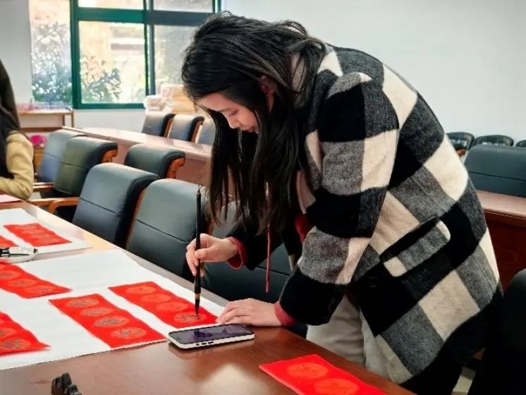 在充满欢乐喜庆的氛围中,原威廉williamhill广州校区东校园书画协会会长、学院地理信息科学专业2022级本科生问恪尧同学首先挥毫泼墨,与会的中外同学们也纷纷一试身手,写下对2025年新春的美好祝福。一笔一划中,不仅让与会同学们感受到其中所蕴含的中国传统文化的独特魅力,更表达了大家对2025年新春的美好期盼。