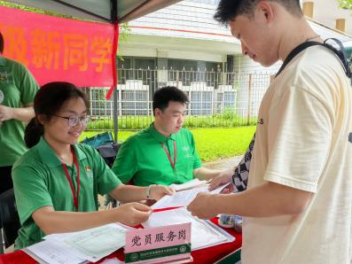 8月19日,新生陆续抵达报到点,党员服务岗的志愿者们全程值守,为新生提供一站式帮助。新生们高效完成数字化报到、材料提交与校园卡领取。现场秩序井然,服务温暖贴心。多位新生在报到后,主动递交入党申请书,以“青春向党”的信念,为大学生活写下初心注脚。家长们在老师与志愿者的耐心讲解中,对孩子的校园生活倍感安心。
