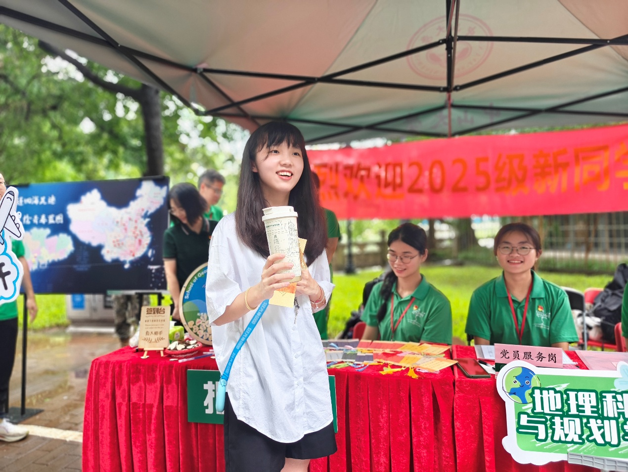 学院以“地连四海足迹,理绘青春蓝图”为主题,精心策划多项迎新互动活动,报到现场热情洋溢、笑语不断。新生们亲笔签下自己的姓名,并将小木片投入地球背景的展示台中,一颗颗木质小爱心填满了星球的空隙;“家乡连线”创意签到,让25级新生们共同绘制从家乡到广州的“求学地图”,以独特的方式在大学校园首次感受“地理”的魅力;趣味问答环节,藏着校史、院史与地理小知识的题目卡上,写满了师兄师姐们的手写祝福,也加深了同学们对学校和专业的了解;惊喜抽奖中,学院特别准备了地理新生“上上签”,为每位新入学的地理学子送出精心定制的咖啡杯、风扇、U盘、卡套等奖品,传递地院专属温暖;相框打卡区里,青春笑脸与“经纬天地”标语同框,定格入学瞬间。
