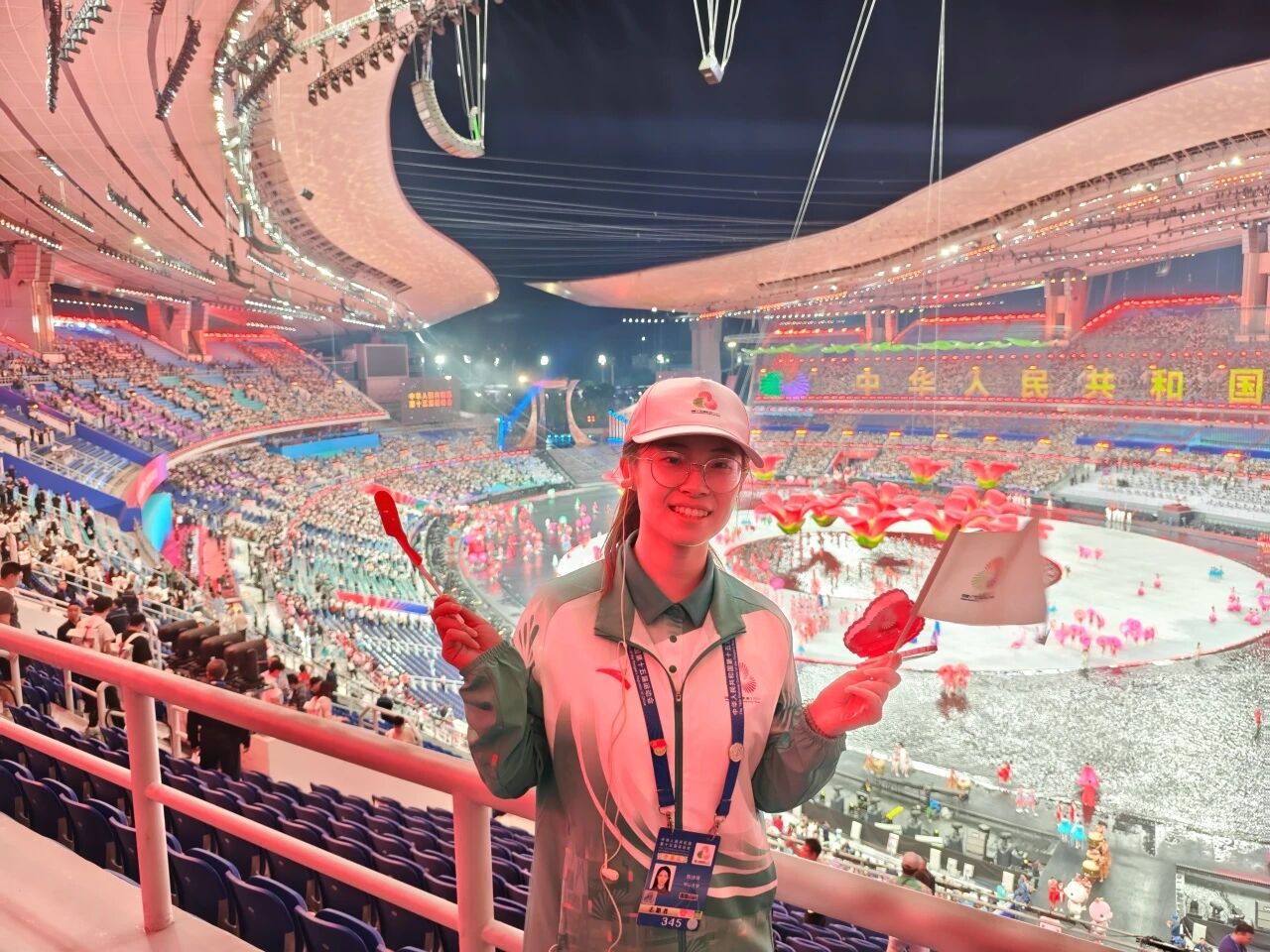 很荣幸能成为十五运会开幕式中大“小海豚”之一,历经一年,从最开始的面试和多轮笔试,层层筛选,我最终站在了看台志愿者的服务岗位上。隔两天就去一次的早7晚12的培训演练虽然辛苦,但也收获了许多美好的回忆。摆放观众包时秩序井然的团队协作、表演结束后对观众们道声晚安以及离开时一路“小海豚”们的互相挥手告别,一切的疲惫也都随着一声声“拜拜”烟消云散。这段经历不仅让我收获了许多热情友好的朋友,更让我感受到青春年少。