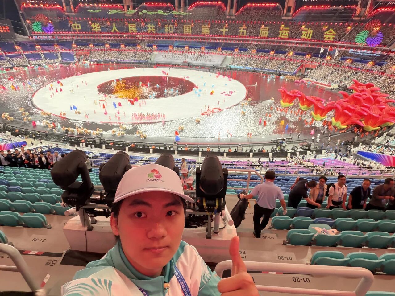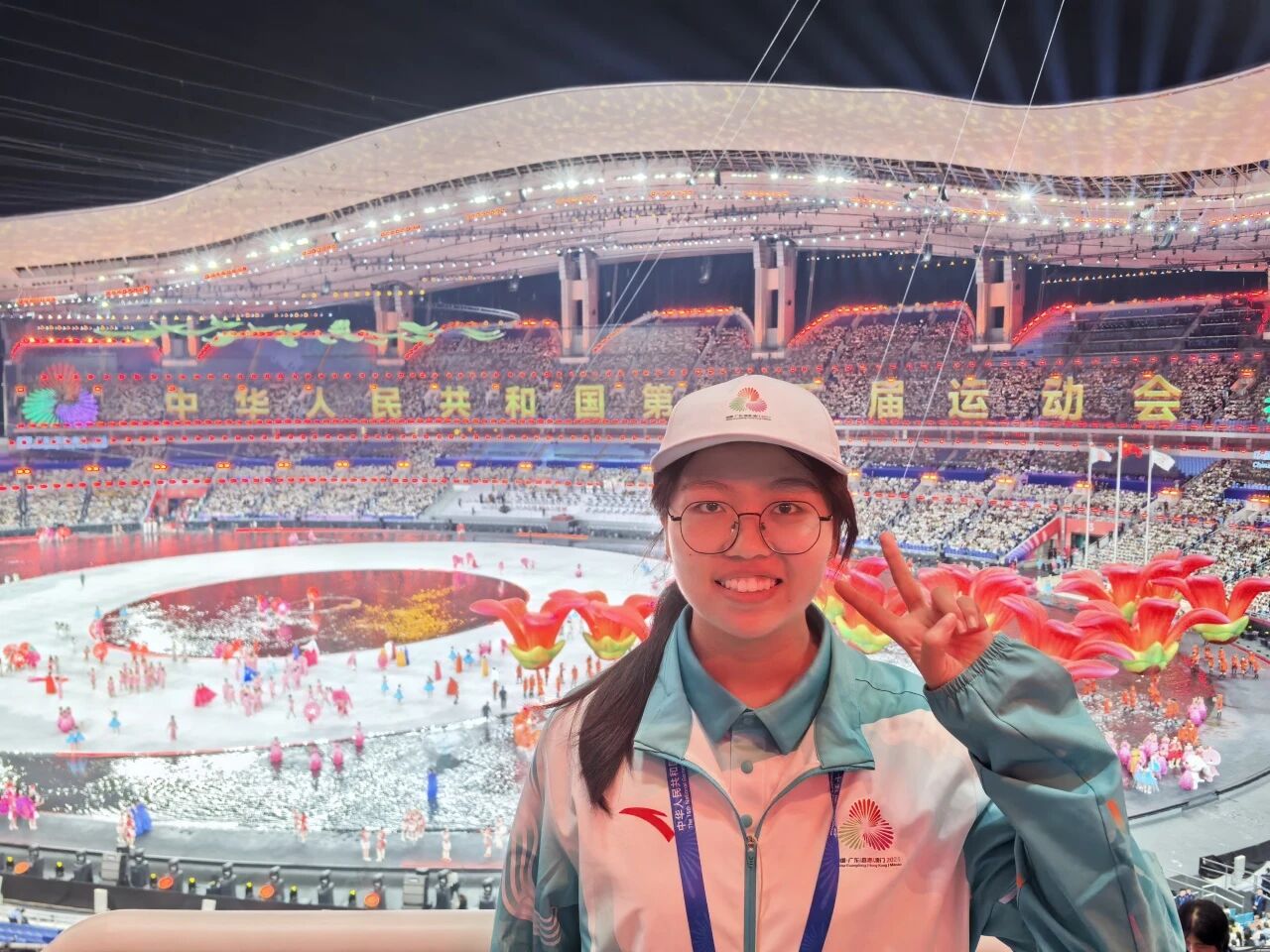 在本次第十五届全运会开幕式中,我服务于志愿者啦啦队。从开幕式前的广州赛区志愿者出征仪式,到之后的深圳赛区马术比赛;从开幕式场馆的志愿者之家、后勤服务,再到观众席上活力四射的啦啦操暖场表演,都有我们的身影。全运会是国家的大事,而我作为其中一颗小小的螺丝钉,却收获了看待世界的宽广视角。赛场运动员们咬牙坚持的样子,志愿者朋友们互帮互助的身影,都无疑会在我的青春岁月里留下一抹亮丽的色彩。