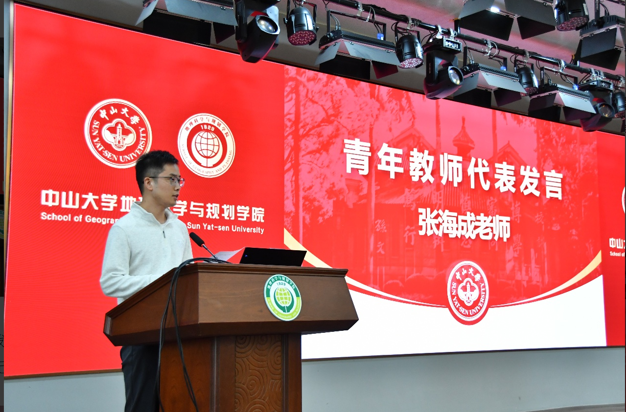 张海成副教授作为学院培养的2008级自然地理专业本科生,回归学院后已经成长为国家级青年人才,他向荣休前辈与卓越服务奖获奖老师致以崇高敬意。他细数当年老师们在教学中的严谨细致、在科研中执着奉献的感人点滴,感谢他们用数十载的坚守,践行着“传道、授业、解惑”的神圣使命,感谢他们将青春与智慧献给了三尺讲台,献给了一届届求知若渴的莘莘学子。他表示将永远感念这份师恩,将会把他们矢志传承的这份严谨治学、甘于奉献的中大地理人精神视若珍宝,接力传承,并代表青年教师郑重承诺,“必将以你们为榜样,恪守师道,勇攀学术高峰,用行动续写学院新的辉煌”。