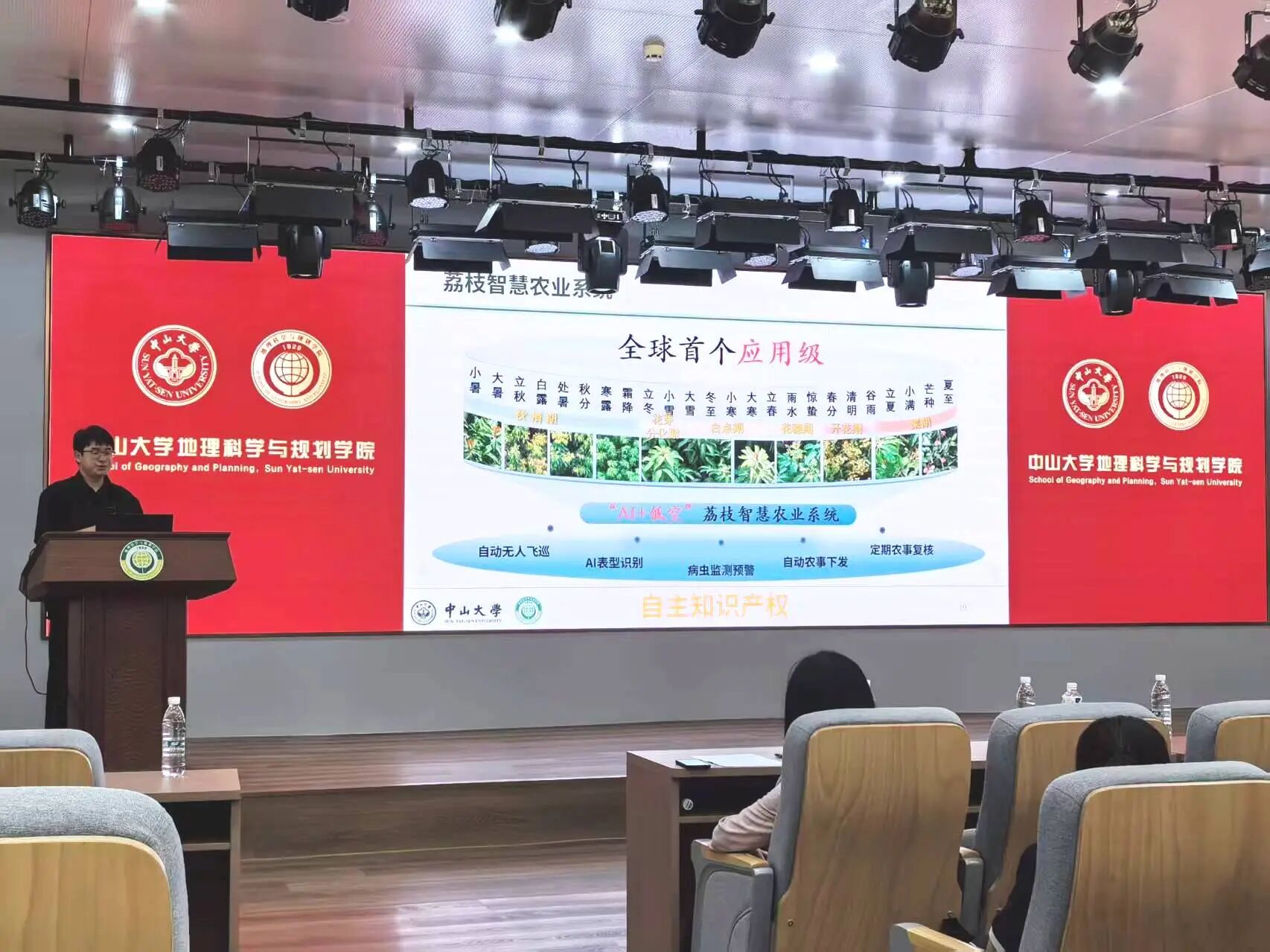 特色展示环节凸显科技赋能与实践价值。院长助理齐志新副教授展示了无人机值守库设备及其在遥感监测、智慧城市等领域的应用;飞鸟团队的傅浩同学则分享了“飞鸟管家・空天地一体化智慧农业管理系统”,生动展现地理技术在智慧农业中的实际成效。在屏幕实时呈现的无人机巡查影像与鲜活的荔枝种植案例中,前沿技术从课堂走向现实,同学们不仅听得入神、看得真切,更点燃了对科技应用与专业实践的浓厚兴趣。