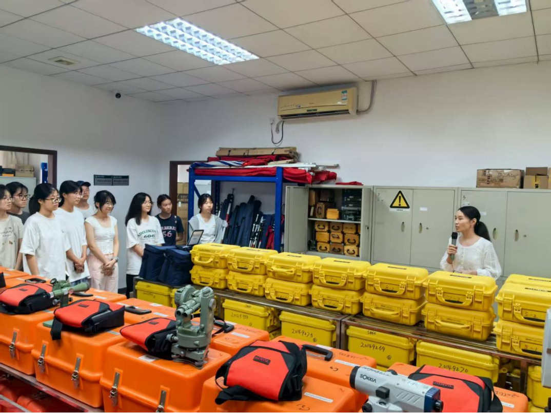 实验室参观环节让同学们走进数字测绘与水环境两大专业实验室,沉浸式感受科研的严谨与乐趣。在数字测绘实验室,孙颖老师详细讲解了垂线仪、全站仪等仪器的工作原理与操作流程;水环境实验室中,黎坤老师围绕离子色谱仪等核心装备,详解水体碳含量计算方法,展示不同课题组的实验进程。同学们近距离观察仪器运作、聆听细致讲解,不仅加深了对专业设备与实验逻辑的理解,更在心中埋下了探索科研未知的种子。