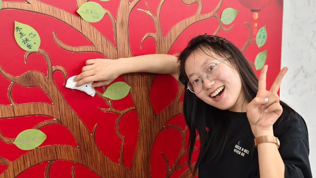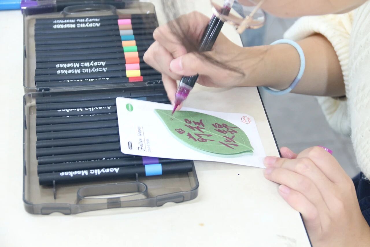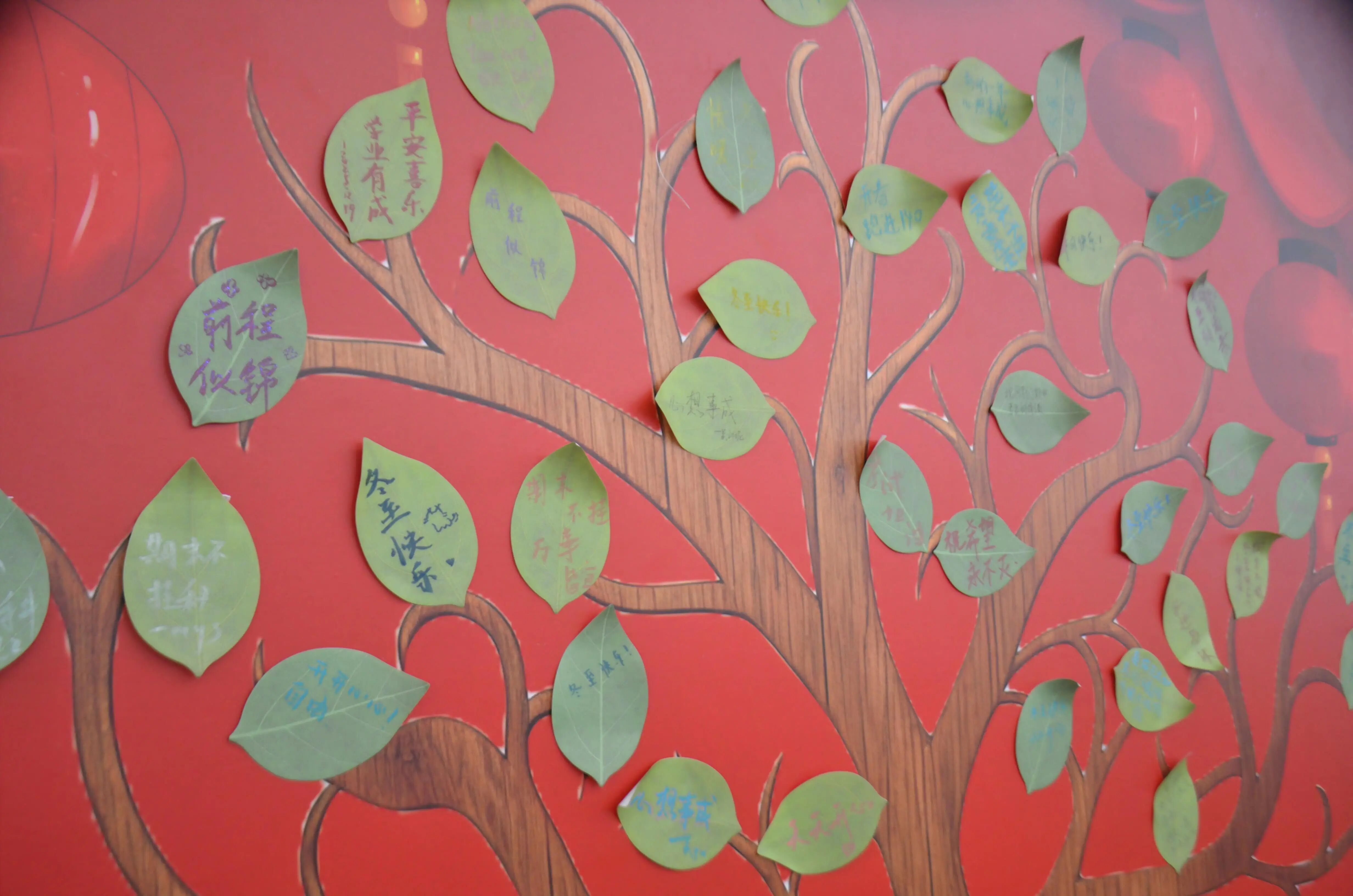 同一时间,南校园松涛园四楼的冬至氛围也十分浓厚。师生们陆续到场,在签到处领取可爱饺子挂件,并在树叶形便签上写下心意满满的祝愿,贴满“冬至树”,满载着美好期许和别样意义。